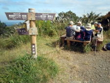 360度展望の陣馬山はさすがに人気の山です。多くの人たちが山頂のベンチや茶店で思い思いの休憩を取っています。私たちもちょうど空いたテーブルで昼食をとりました。山行メンバーのうちの二人は名物のナメコ汁にありつこうと茶店に下りていきました。多くの山々が見えたのですが、雲がちょっと多く残念ながら富士山は見えませんでした。