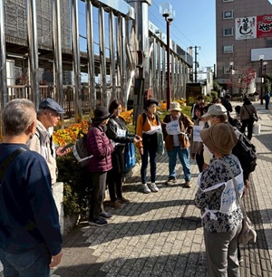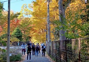 11月15日、平和村チャリティ・ウォークを実施しました。今年は参加者が少なく心配していましたが、12人で歩きました。宿橋を渡り田村酒造をぐるりと回り、玉川上水沿いに出て、加美上水公園で休憩、その場でドイツ平和村の紹介をしました。今回は初めて担当し会員は、紙芝居仕立てで分かりやすし説明をしました。次に立ちよった自然塾ビジターセンターでは、自己紹介・参加動機を話し交流しました。ここでは自然塾の塾長が「東海居」いわれなど、また保存している品々の説明をしたくれました。その建物を覆うようなモミジが紅葉しとても美しいさまでした。