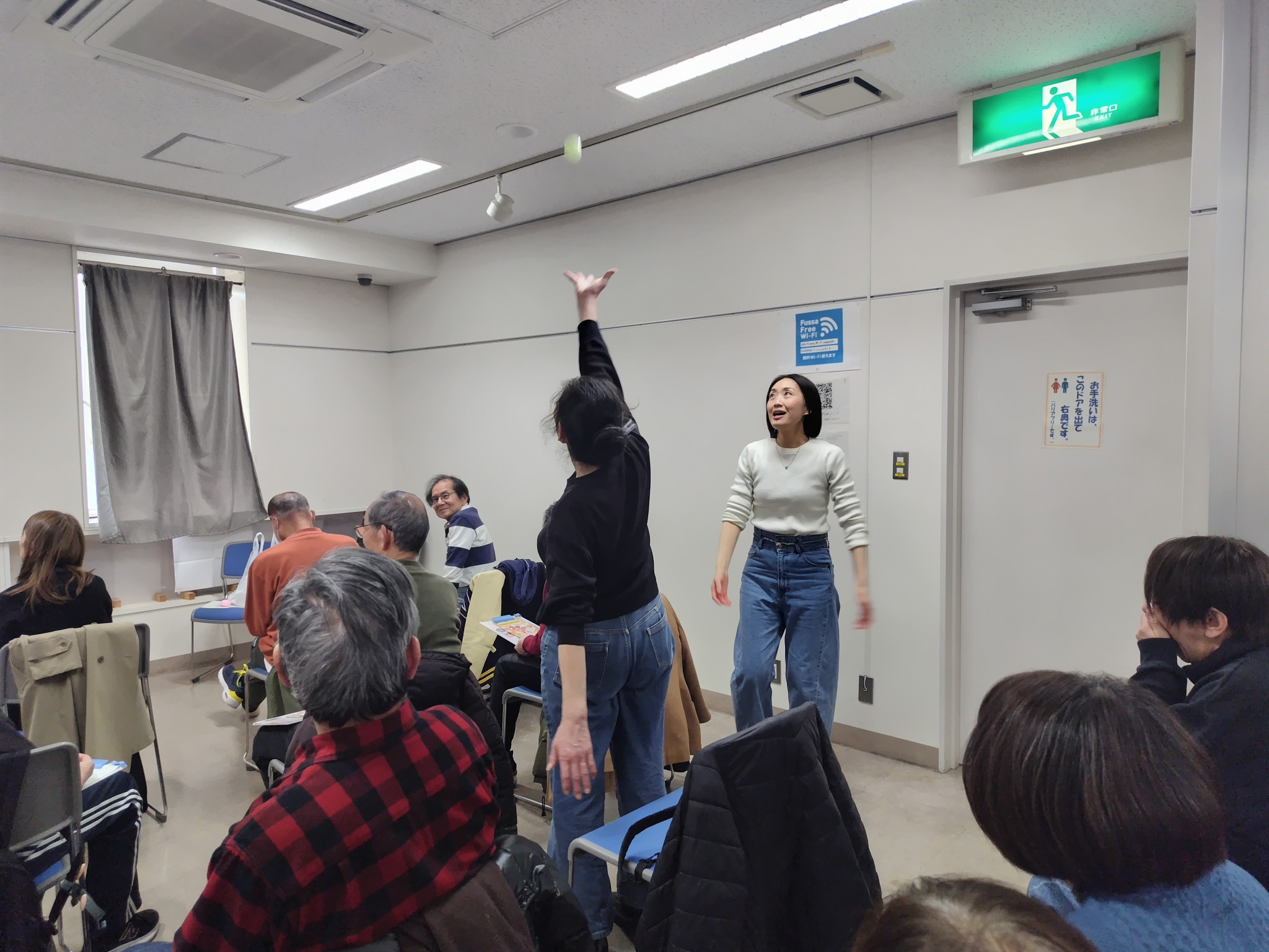 ・参加者は講師から名前を呼ばれたら、腹式呼吸で空気をたくさん吸い、それぞれ好きなタイミングでボールを上に投げ上げ、発声をしながらリズム をとって声を出すワークを一人ずつ順番に行った。ワークの過程で段々と声が通るようになるのを参加者は実感でき、 最後に講師から「声を出すこと