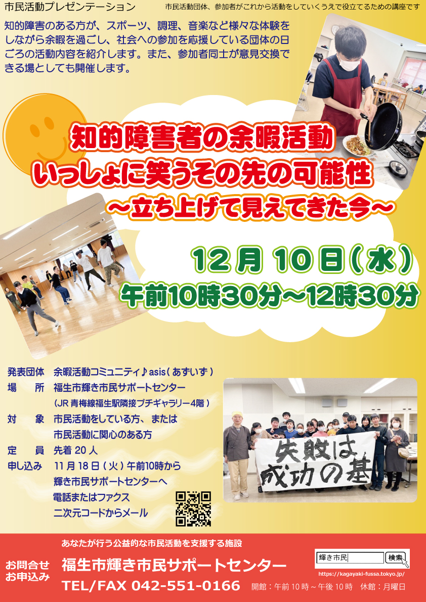 発表団体:余暇活動コミュニティ♪asis(あずいず) 先着 20人(無料) 申込み 11月18日(火)10時から、輝き市民サポートセンターへ 申込書持参、または電話、FAX : 042-551-0166 下記をクリック、または右の二次元コードからメール下さい。 mail:kagayakishimin@forest.ocn.ne.jp  |
