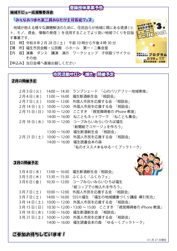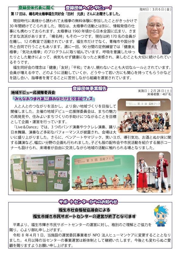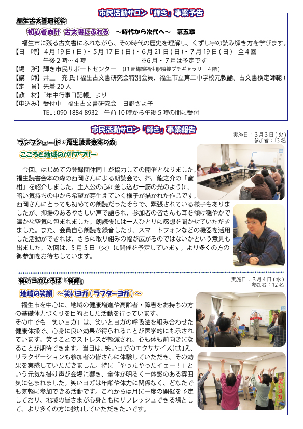 | 東京都福生市大字福生1014-10福生市プチギャラリー(JR福生駅西口)4階 TEL&FAX 042-551-0166 Copyright(C) 2005 Fussa city All right reserved. 福生市輝き市民サポートセンター |